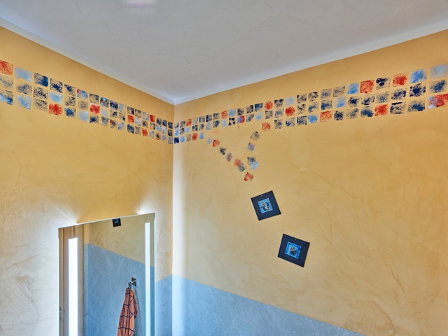 Gegenüber deckenden Anstrichen wirken lasiert bearbeitete Oberflächen offen und raumerweiternd - lebendige Flächen ohne absperrende Wirkung. Die Technik kann durch die Einarbeitung von Schablonentechnik perfektioniert werden.